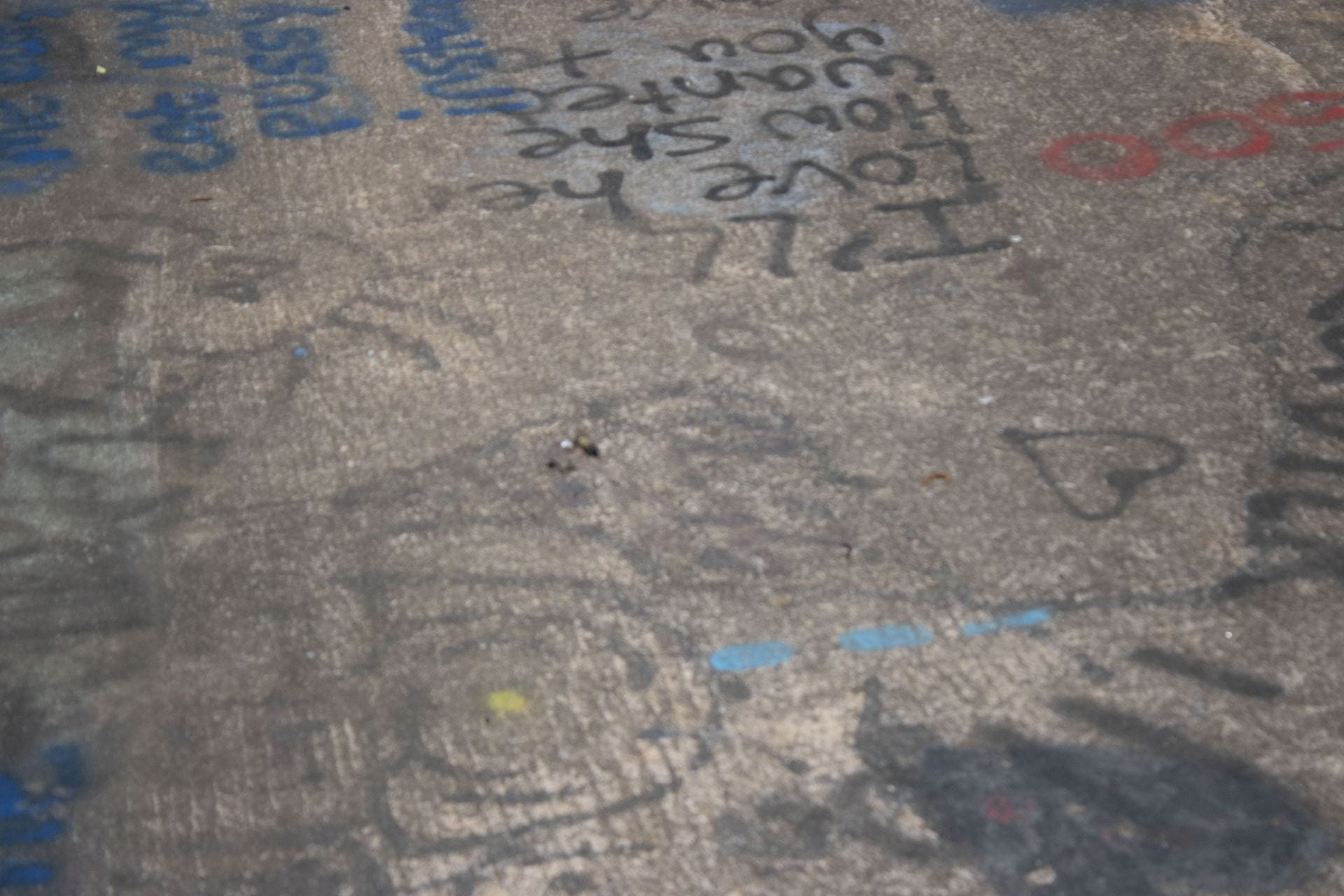 There's a bee, out of focus, in the middle of this picture. Its spent the last several minutes tormenting me. No clue what its looking for on this concrete, flowerless bridge.