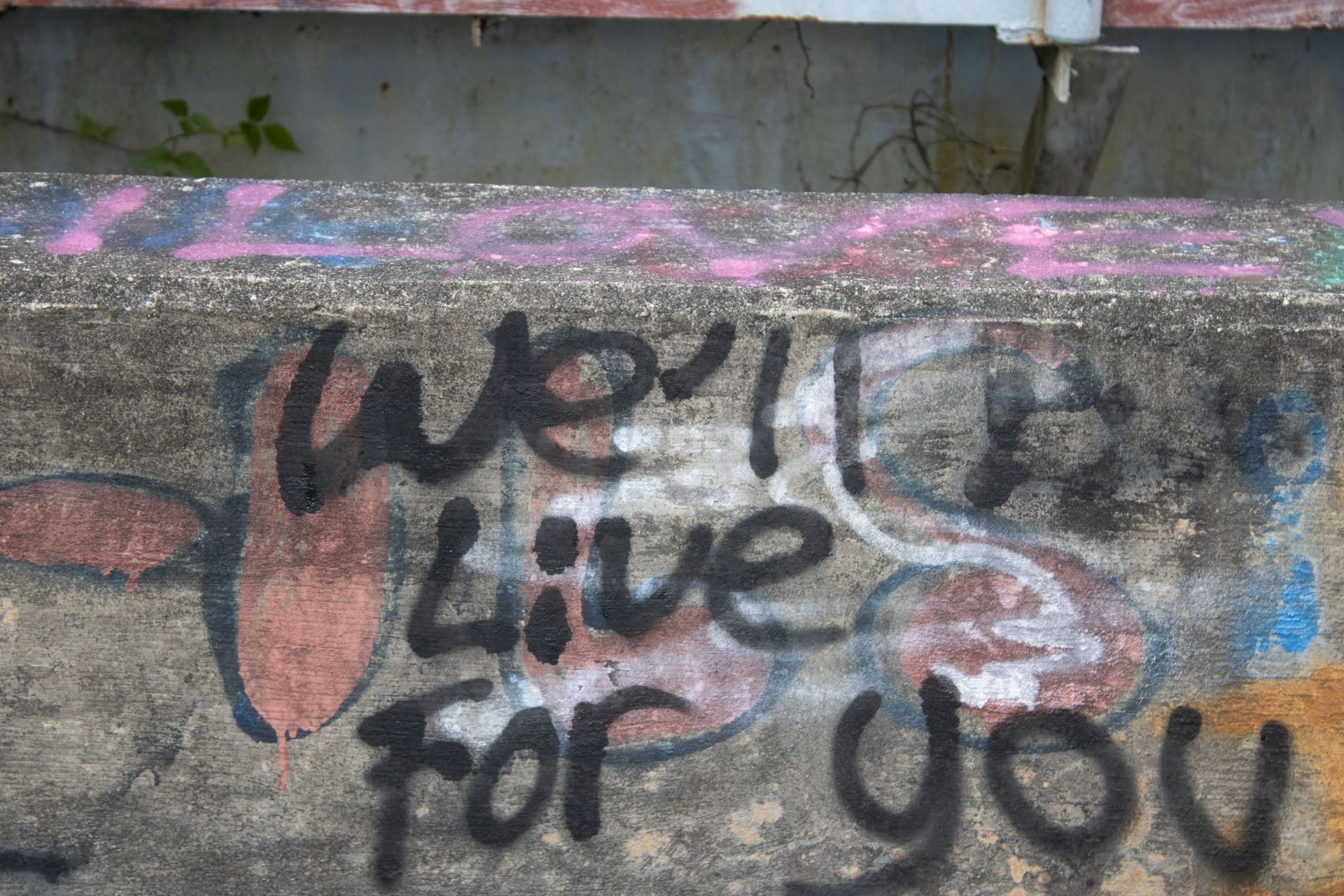 Graffiti reading "We'll live for you". Looking over the freshest looking graffiti, it seems like recently someone came here to honor the passing of someone named Wynn. I feel guilty being here. Exposed.