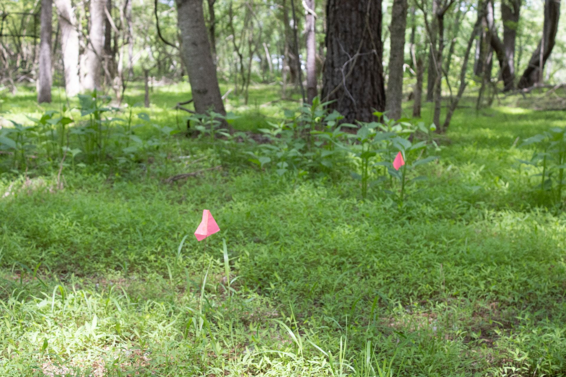 A pair of pink flags, serving as a reminder of the reserve's real purpose; water flow. The flags signal the location of undrerground pipes, from which rainwater and runoff flow into the chattahoochee river.